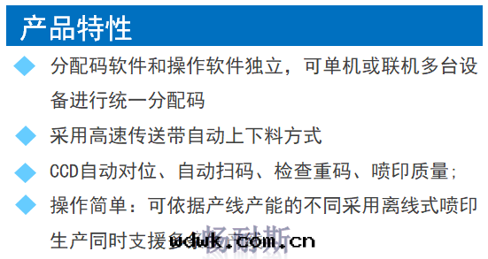 • 産品描述:AP-800B是(shì)一款結合機(jī)器人自(zì)動(dòng)上(shàng)下(xià)料在(zài)線(xiàn)式噴碼機(jī),采用(yòng)多(duō)轴运動(dòng)控制驅動(dòng)噴碼头(tóu)完成(chéng)各(gè)種(zhǒng)噴印(yìn),包括1D,2D,字(zì)符,數字(zì)等,具有(yǒu)噴印(yìn)面(miàn)積廣,效率高(gāo),清(qīng)晰度(dù)高(gāo)等優點(diǎn),産品用(yòng)噴碼機(jī)标(biāo)識後(hòu)具有(yǒu)良好的(de)可(kě)追溯性(xìng),提高(gāo)企業的(de)質(zhì)量管理(lǐ)及産品的(de)區(qū)域管理(lǐ)。